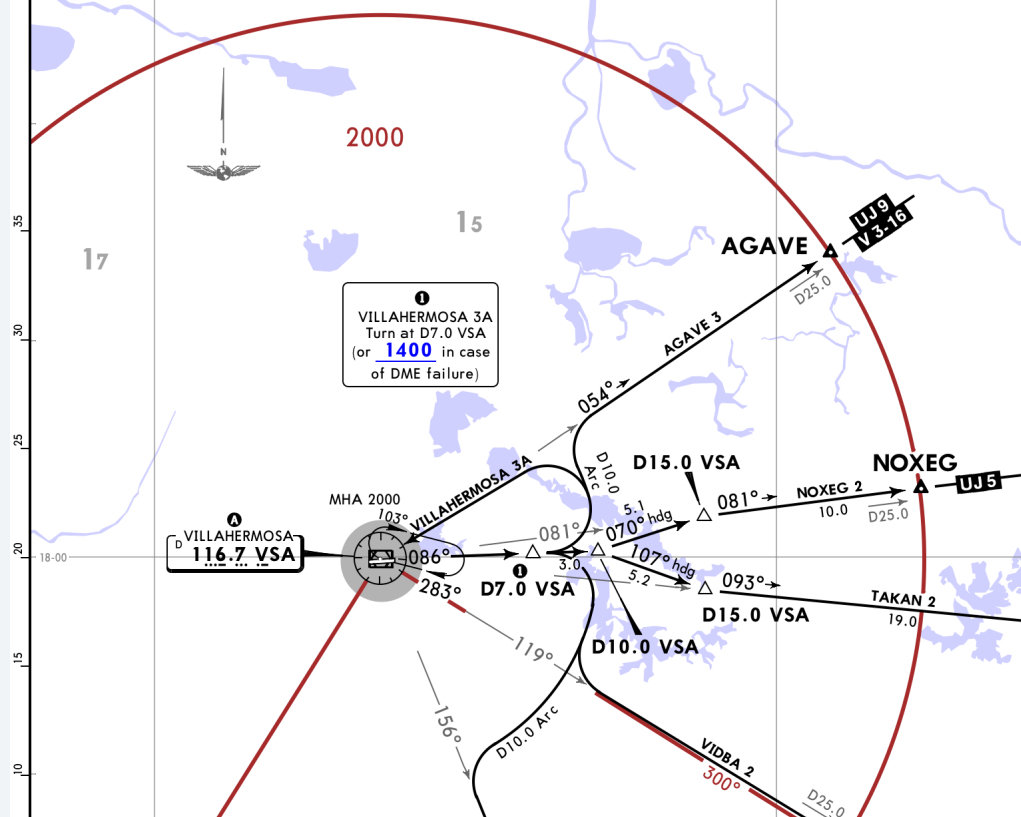 Firstly, we could imagine about the engine-out procedure. As there is no significant terrain in Villahermosa (VSA-MMVA), though, no turn procedure is required due to obstacle clearance.